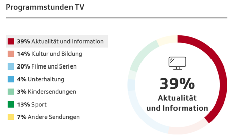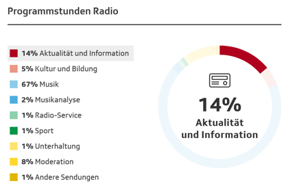 Im Jahr 2024 betrug der Anteil von «Aktualität und Information» in den Radioprogrammen der SRG lediglich 14 % der Programmstunden, bei Fernsehen SRF betrug dieser Anteil 39 % der TV-Programmstunden.[6]