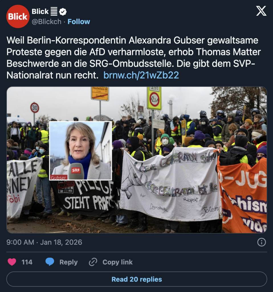 «Endgültig nicht sachgerecht» sei das Schlussfazit der «Tagesschau» vom 29. November gewesen, hält die SRG-Ombudsstelle fest. Der Entscheid betrifft den Bericht über gewalttätige Proteste gegen eine Veranstaltung der AfD in der deutschen Stadt Giessen.